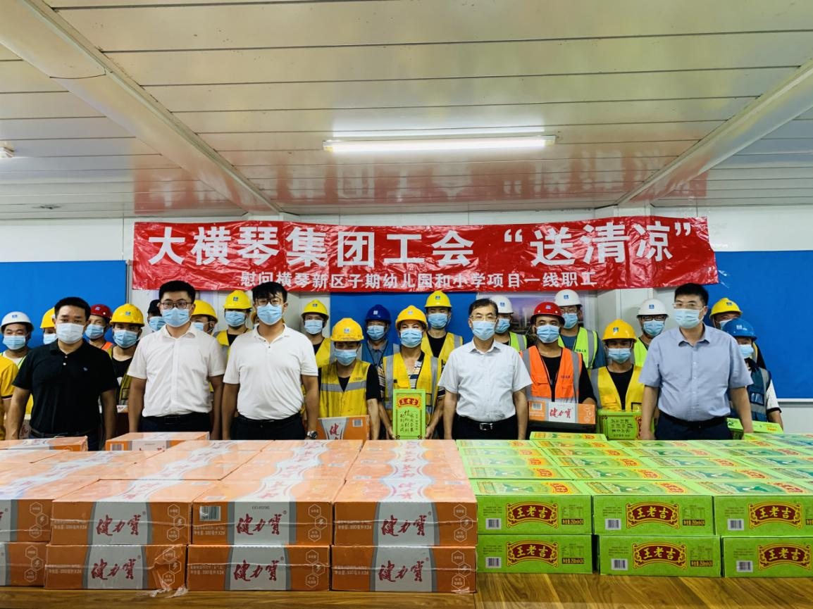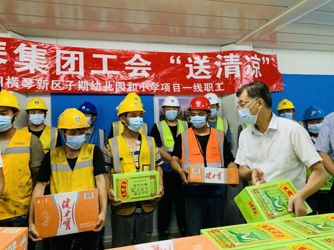 為進(jìn)一步加強(qiáng)高溫作業(yè)職工勞動保護(hù)工作,關(guān)愛堅(jiān)守在項(xiàng)目一線的建設(shè)者,2021年7月,大橫琴集團(tuán)黨委書記、工會主席田偉帶隊(duì)分別赴科學(xué)城(二期)標(biāo)段一、標(biāo)段二項(xiàng)目、橫琴醫(yī)院項(xiàng)目、橫琴新區(qū)子期幼兒園和小學(xué)及保稅一小工程項(xiàng)目開展夏日送清涼慰問活動。