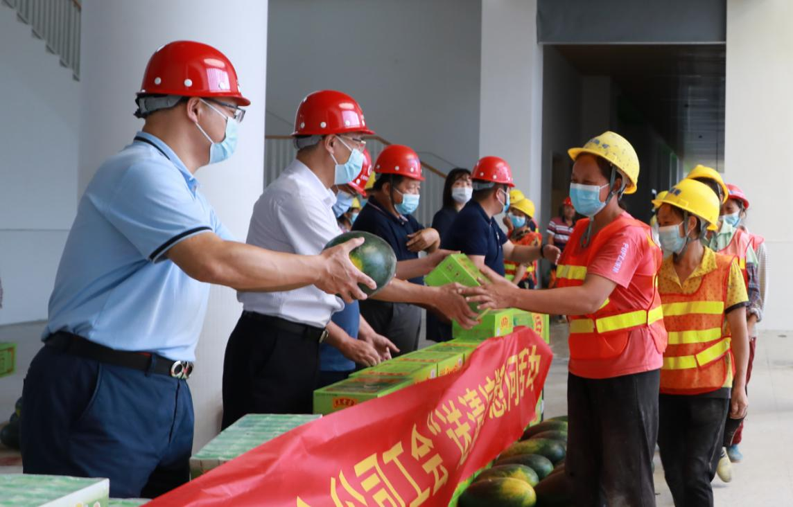 在項(xiàng)目現(xiàn)場,慰問組一行與項(xiàng)目負(fù)責(zé)人深入交流,詳細(xì)了解一線職工工生產(chǎn)生活情況,現(xiàn)場查看施工安全生產(chǎn)、勞動保護(hù)和防暑降溫措施,并送上清涼飲料等慰問品。