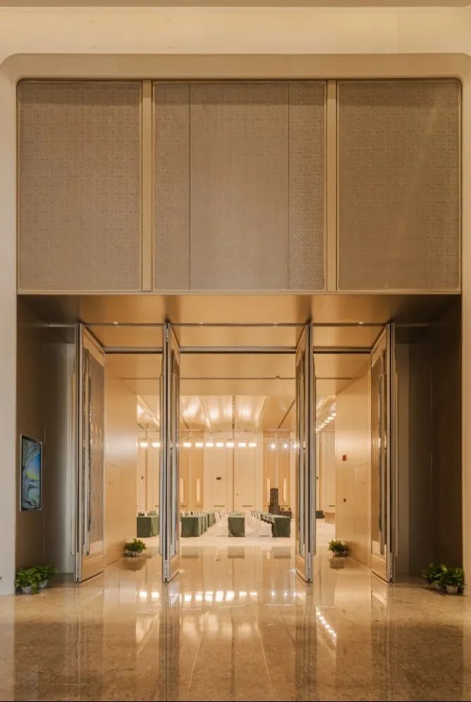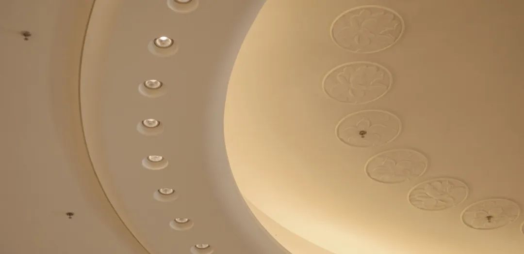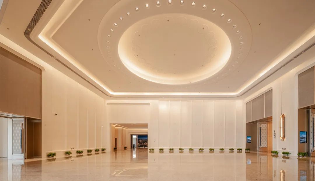 會議中心前廳頂面采用25朵花代表澳門回歸祖國25周年,造型中提取木棉花、蓮花寫意形體作為裝飾元素,圖案相互交錯,寓意“一國兩制”方針下粵澳共商、共建、共管、共享的新模式。