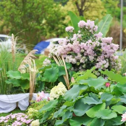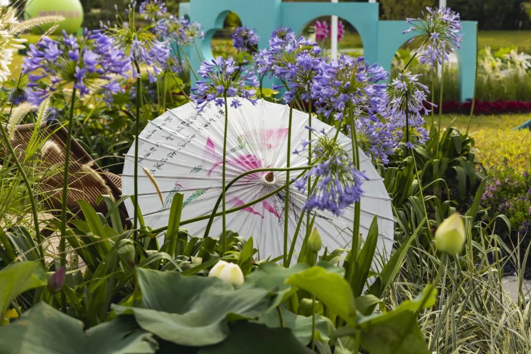 展園整體以典雅氛圍為基調(diào),白荷花與藍(lán)紫色的百子蓮則為點(diǎn)睛之筆,形成視覺(jué)焦點(diǎn),現(xiàn)代素材與傳統(tǒng)意境相互碰撞,打造清新與浪漫的場(chǎng)景。