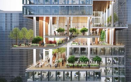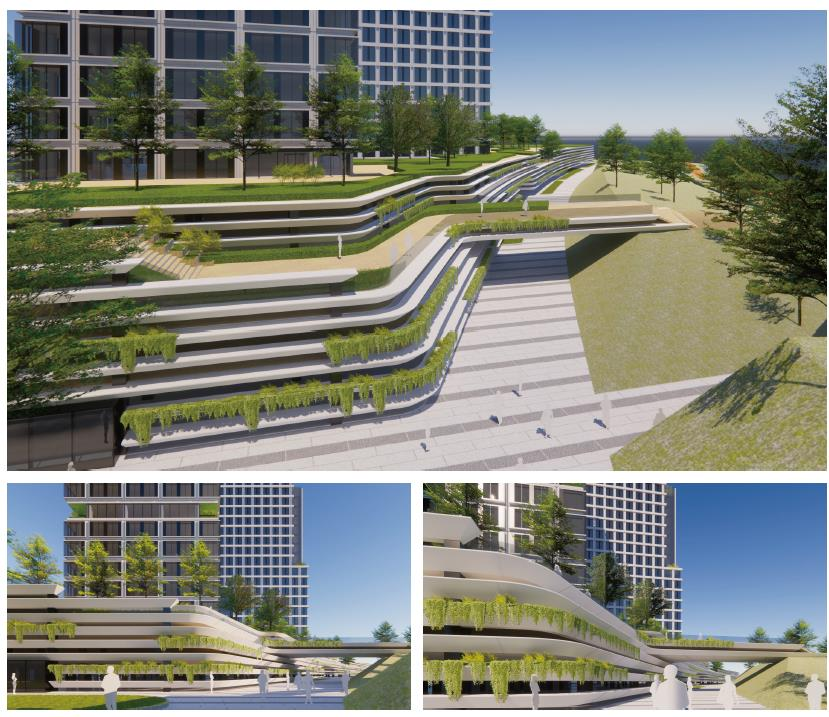 建筑組團(tuán)中央,通高兩層的“城市客廳”成為思想碰撞的熔爐;三層空中云臺(tái)通過(guò)有蓋廊道串聯(lián)樓宇,形成全天候的公共步行紐帶;而垂直分布的空中花園與地面綠脊,共同構(gòu)建出覆蓋率超30%的生態(tài)綠脈。
