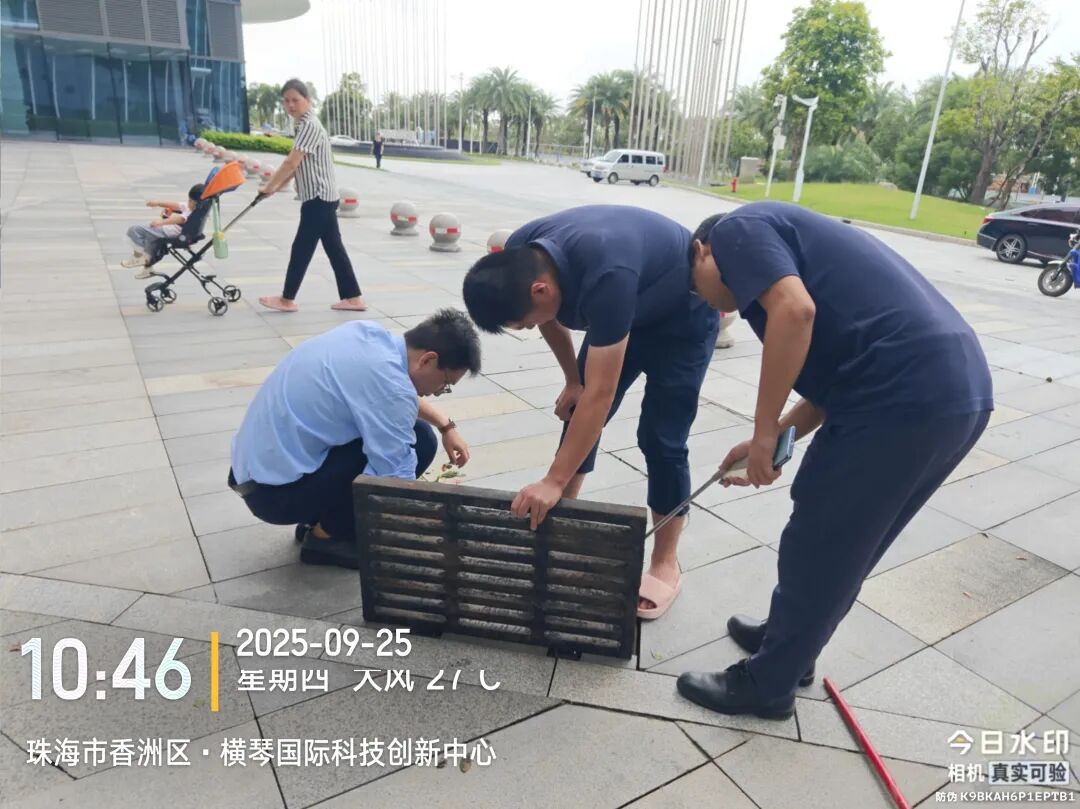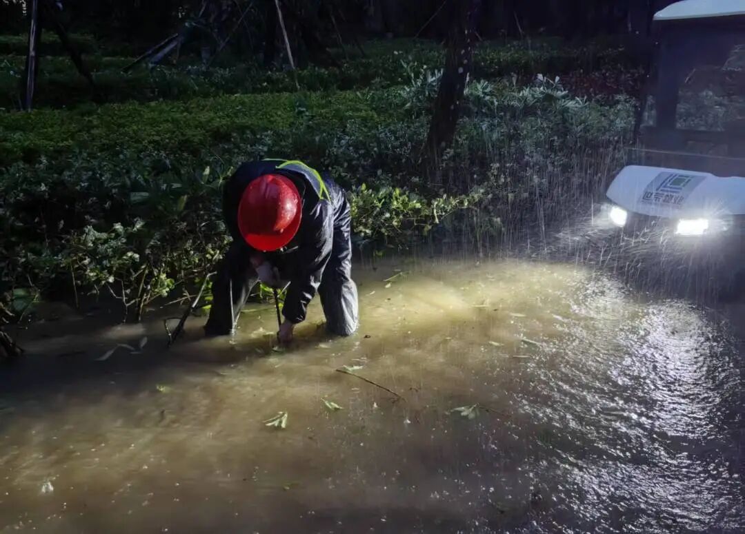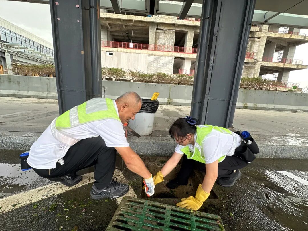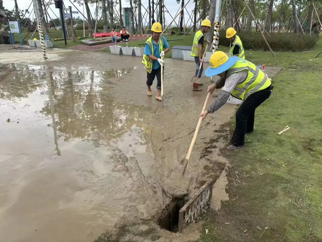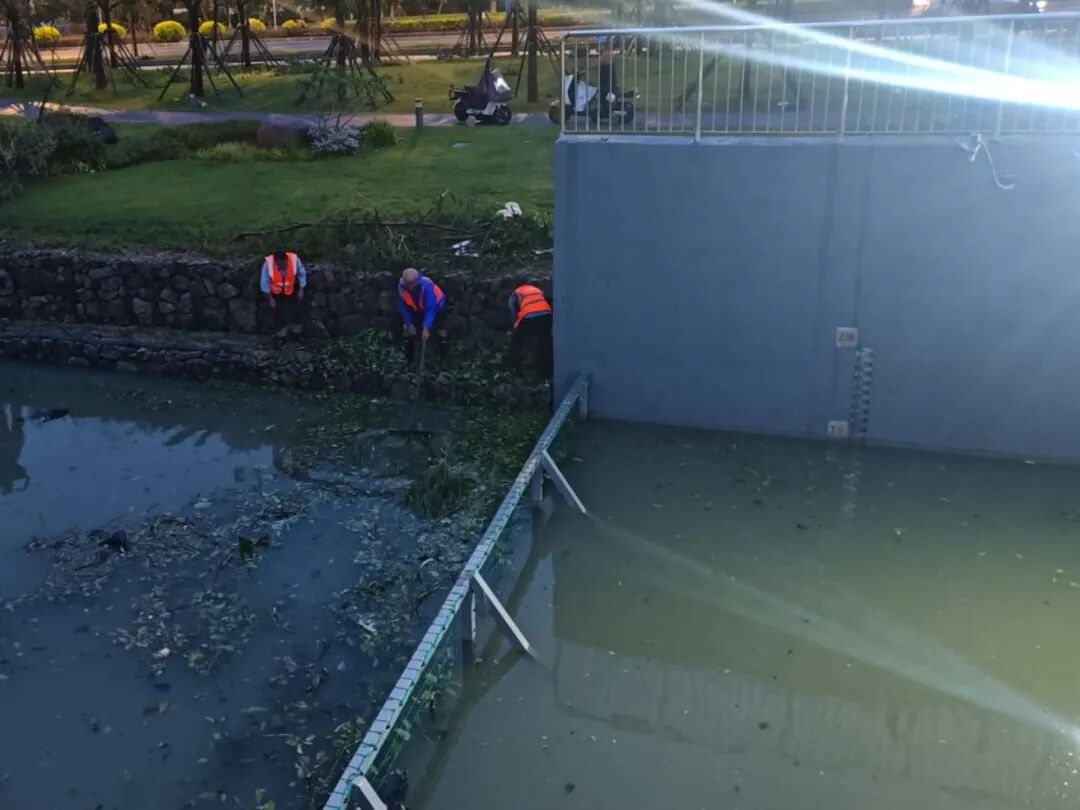 臺風(fēng)期間,受風(fēng)暴潮影響,橫琴天沐河水位上漲,珠光集團迅速組織搶險力量,通過加筑沙袋有效阻止海水倒灌進(jìn)天沐河,同步安全轉(zhuǎn)移設(shè)備設(shè)施,并緊急安裝抽水設(shè)備清理積水,避免變電房被水浸泡。臺風(fēng)過境后,搶險隊伍立即投入后續(xù)清理工作,第一時間清理泵站進(jìn)水口垃圾,保障泵站排水通暢,降低村渠水位;清理排水口垃圾,保障土渠排水暢通;并全力協(xié)助合作區(qū)市政管理署,清理倒塌的邊境圍網(wǎng)。
